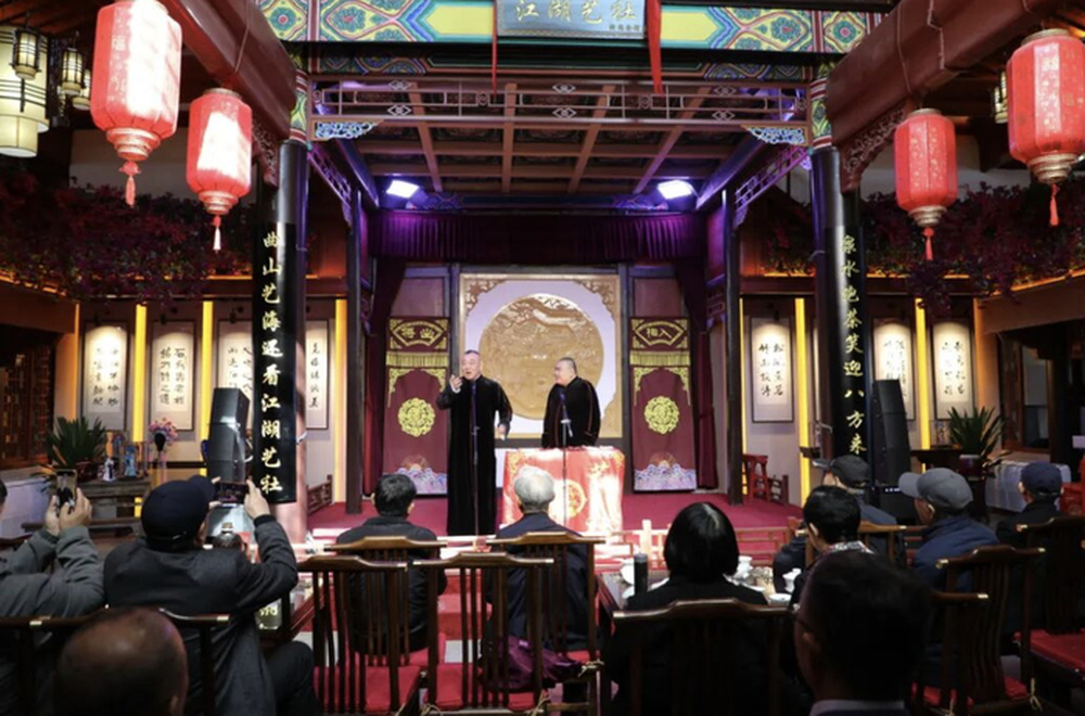 会馆内,相声专场笑声不断,市民游客在古韵建筑中感受别样年味。