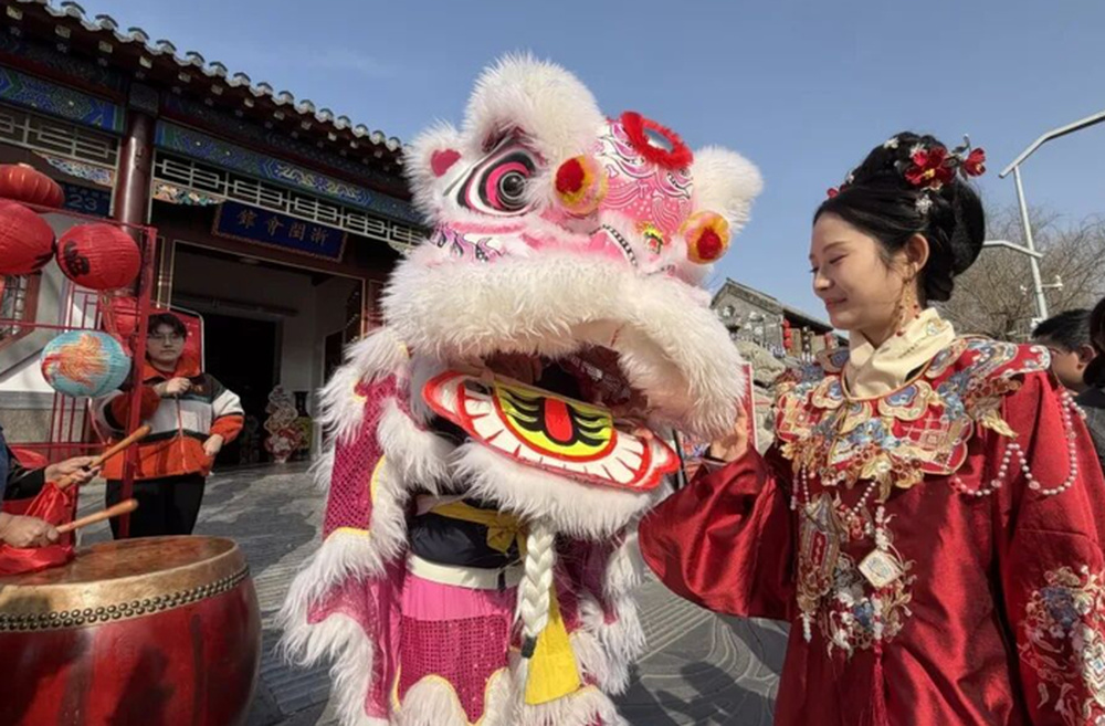 江湖艺社的演员们身着传统服饰,舞狮表演引得阵阵喝彩。