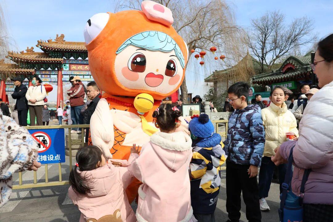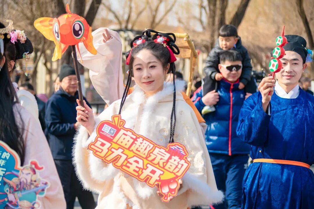 值得一提的是,以“门神”秦琼、尉迟恭为首的古风巡游也在明湖市集惊喜亮相。贴门神是自古便有的传统春节习俗,秦琼、尉迟恭更是最具代表性的门神形象。作为山东省非物质文化遗产,“秦琼传说”起源于五龙潭,承载着“忠孝义勇信”的文化内核。秦琼、尉迟恭两位门神与众多古风NPC现身明湖市集,与游客展开巡游互动,为市民游客护平安,送吉祥,传递新春的美好祝福。