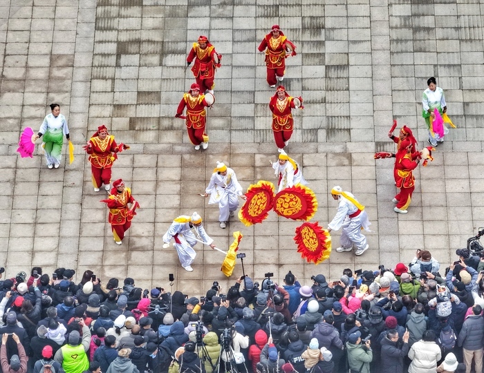3月3日,农历正月十五,济南千佛山景区南门广场锣鼓震天、游人如织,一场别开生面的非遗展演——2026年济南市元宵节传统舞蹈展演热闹开演,现场“长枪短炮”,观众围了里三层外三层,着实火爆。