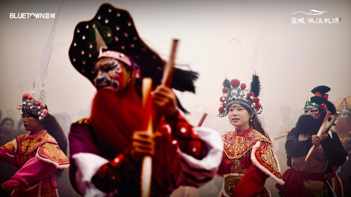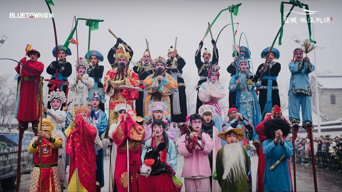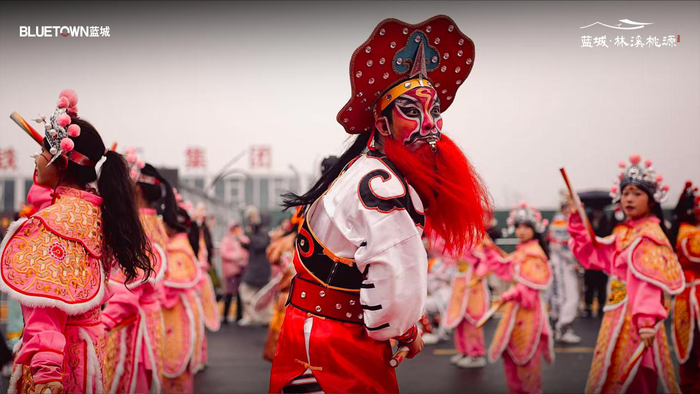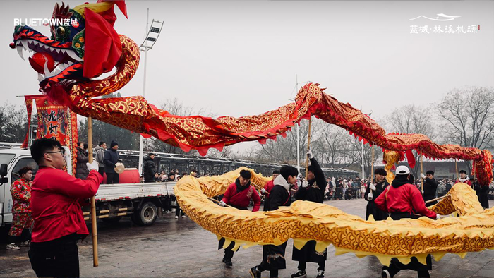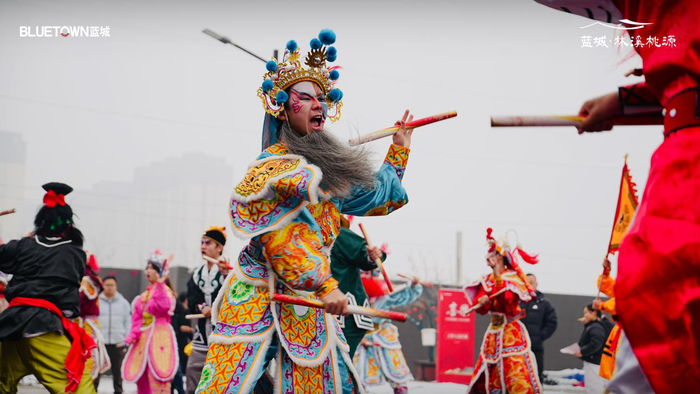从农历正月十三开始,蓝城林溪桃源的中国院子里便热闹起来。鼓声响起,英歌舞队伍踏雪入场,舞者手持英歌棒,步伐铿锵有力。随着鼓点起落,高跷、舞龙、舞狮等传统社火表演轮番登场,吸引众多市民朋友驻足观看。