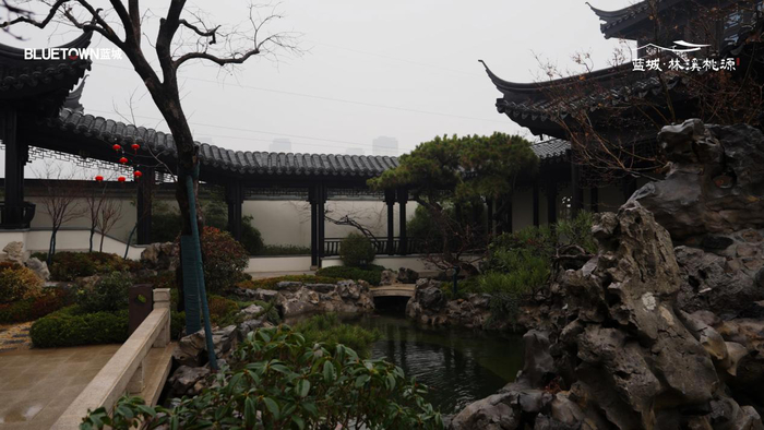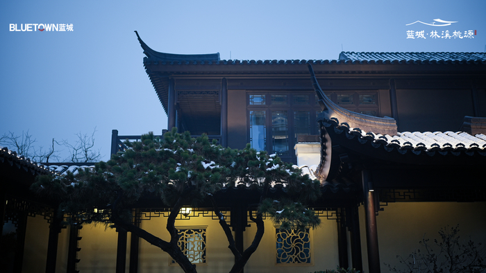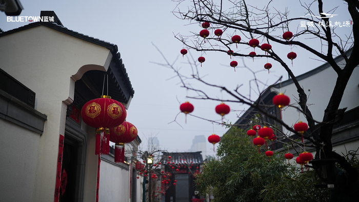 蓝城林溪桃源以中国合院建筑为整体空间形态,院落之间层层展开。院门、廊道、水景与庭院植物共同构成具有东方气息的生活空间。节日期间,热闹的市集与安静的院落形成鲜明对比:院门外人声鼎沸,院门内灯笼轻晃、雪落无声。这样的空间节奏,让传统节日的烟火气在院子里显得格外生动。