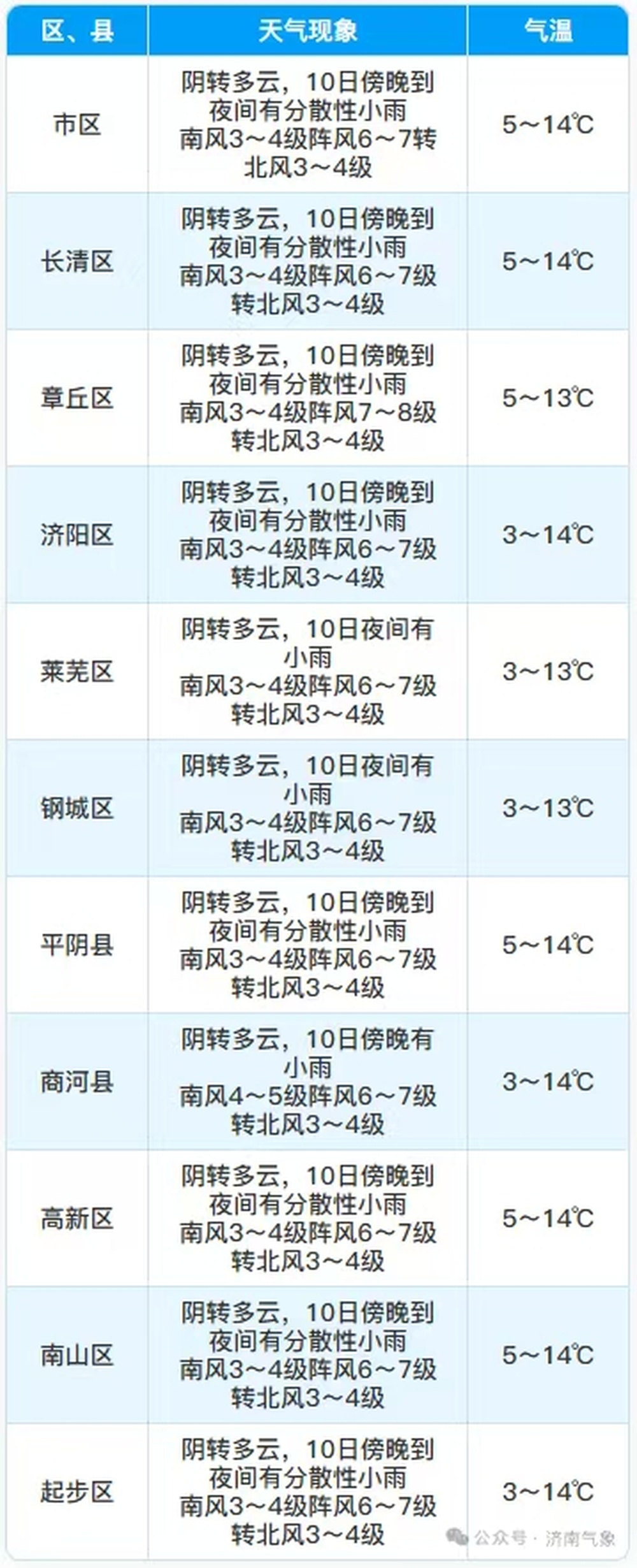 阴转多云,10日傍晚到夜间有分散性小雨,降水概率60%,南风转北风3~4级,最低气温市区5°C左右,其他区县3~5°C,最高气温14°C左右。