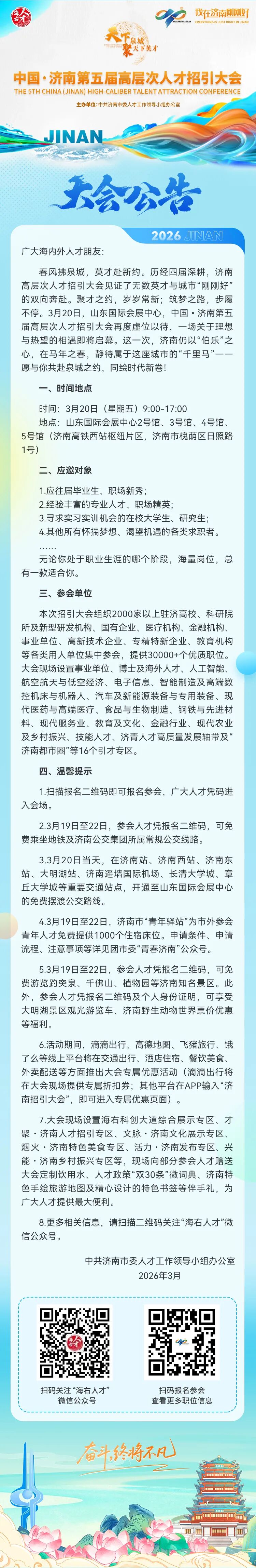 “天下泉城聚天下英才”中国•济南第五届高层次人才招引大会公告