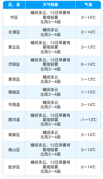 晴间多云,12日早晨有雾或轻雾,北风3~4级,最低气温市区3℃左右,其他区县-1~3℃,最高气温14℃左右。