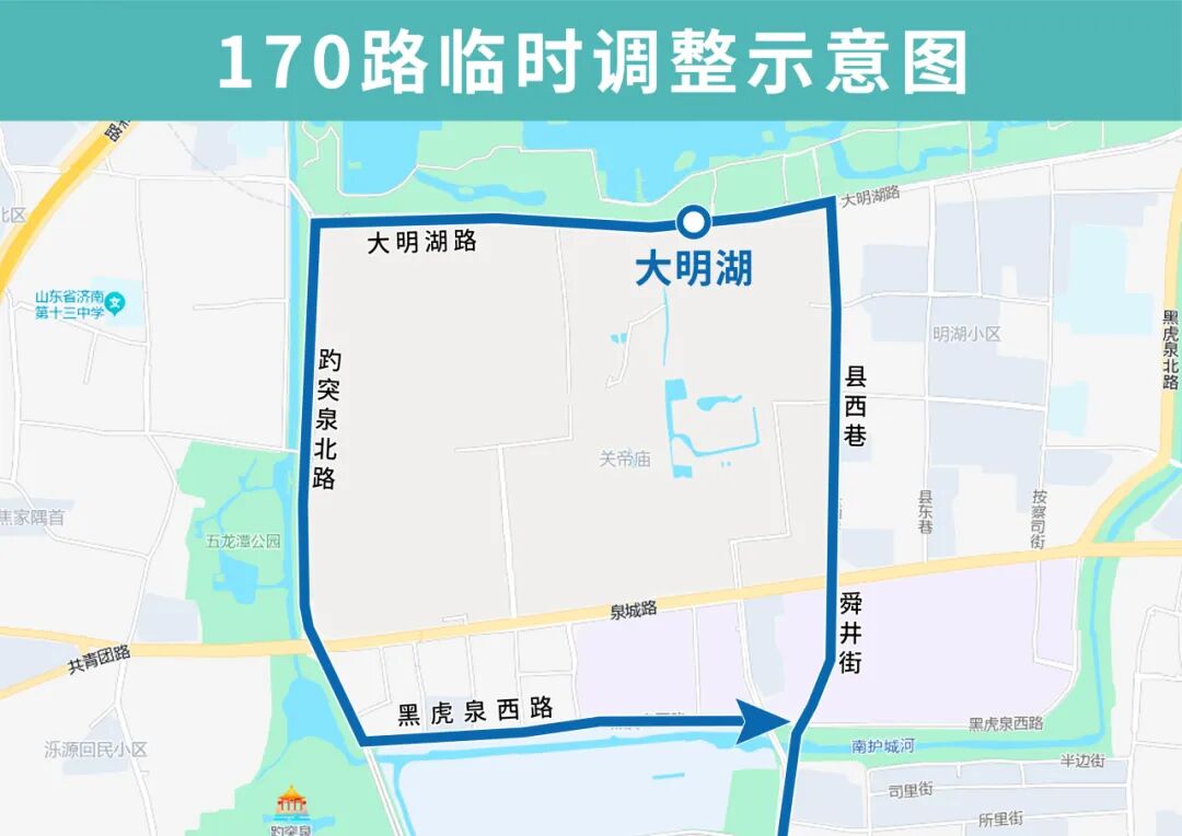 170路临时调整后沿南门大街向北、舜井街向北、县西巷向北、大明湖路向西、趵突泉北路向南、黑虎泉西路向东至南门大街向南恢复原线,临时撤销天地坛街(路北)、芙蓉街(路北)、西门(路北)、大明湖西南门(路东)、省府北门(路南)、大明湖(路南)、县西巷北口(路西)、县西巷南口(路西)、天地坛街黑虎泉西路(路西)站点,临时增设县西巷南口(路东)、县西巷北口(路东)、大明湖(路北)、省府北门(路北)、大明湖西南门(路西)、西门(路西)、趵突泉东门(路南)、泉城广场北(路南)站点。