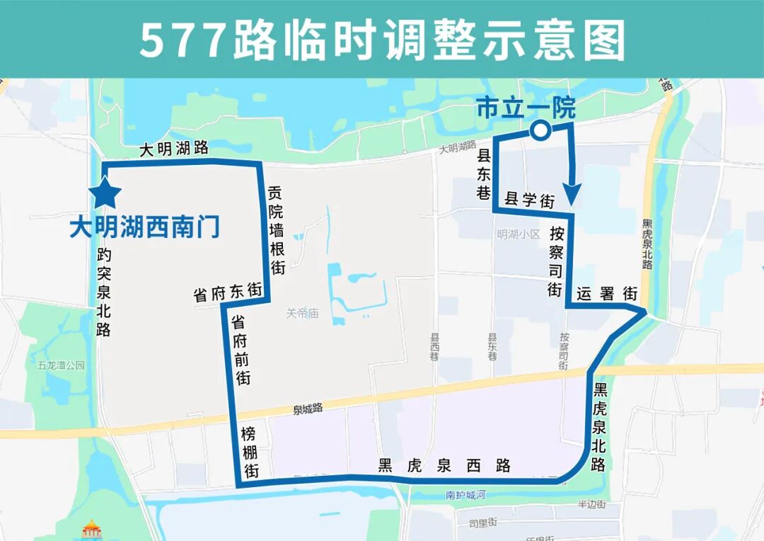 577路临时调整后沿省府前街向南、榜棚街向南至黑虎泉西路向东恢复原线,临时撤销芙蓉街、天地坛街(路北)、舜井街(路东)站点,临时增设榜棚街、泉城广场北、舜井街(路北)站点。