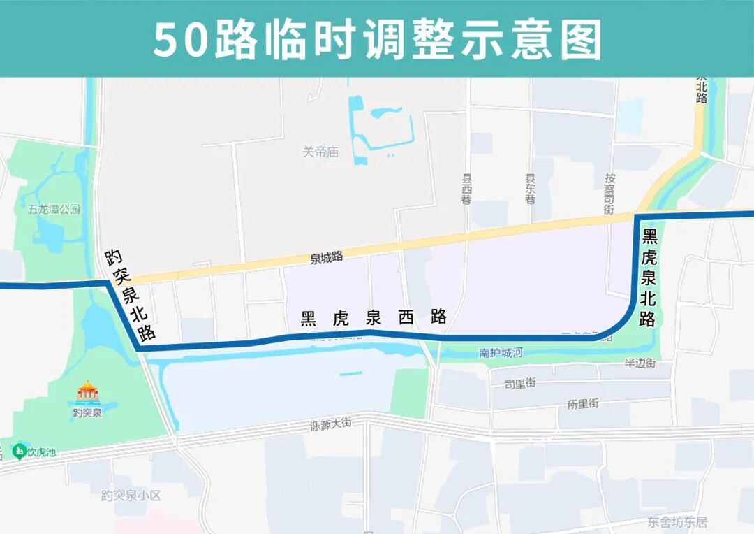 50路临时调整后沿共青团路向东、趵突泉北路向南、黑虎泉西路向东、黑虎泉北路向北至解放路向东恢复原线,临时撤销西门、芙蓉街、天地坛街、青龙桥站点,临时增设趵突泉北门、趵突泉东门、泉城广场北、黑虎泉、青龙桥南站点。