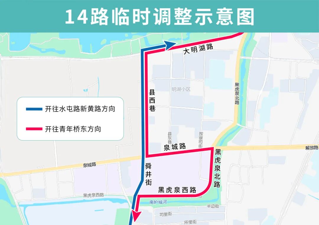 14路临时调整后开往青年桥东方向沿县西巷向南、泉城路向东、黑虎泉北路向南、黑虎泉西路向西至南门大街向南恢复原线;开往水屯路新黄路方向线路不变。临时撤销天地坛街黑虎泉西路(路西)站点,临时增设青龙桥(路南)、黑虎泉(路北)、舜井街(路北)站点。