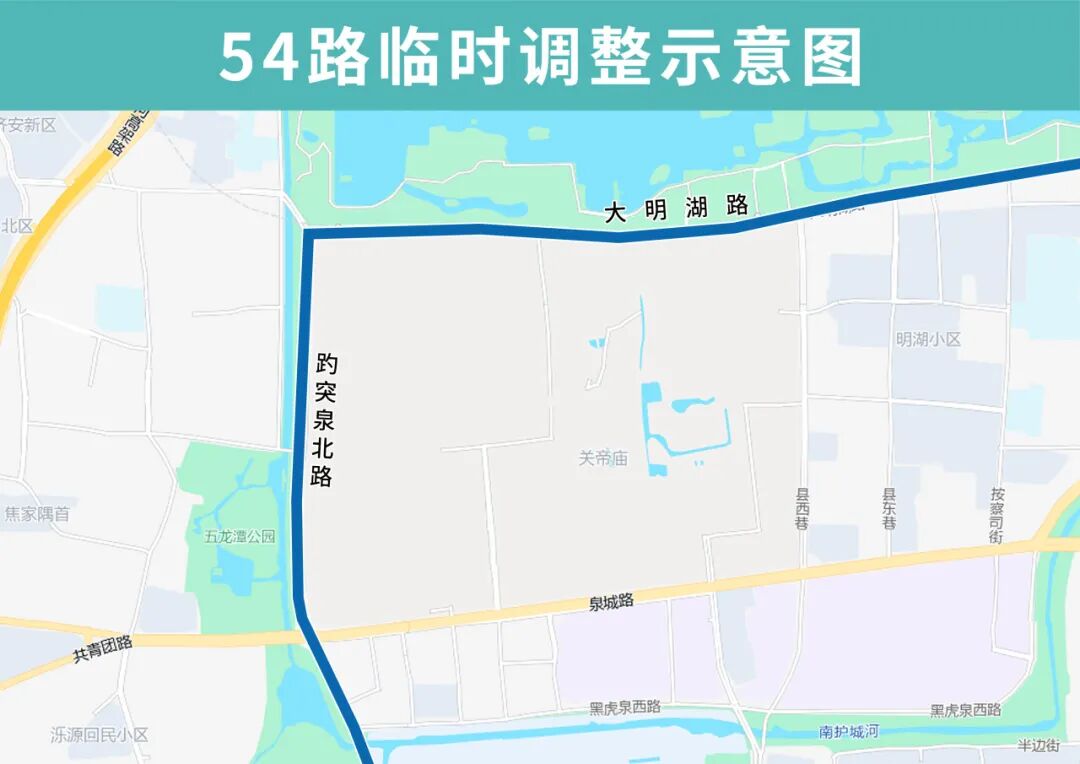 54路临时调整后沿大明湖路向西至趵突泉北路向南恢复原线,临时撤销县西巷北口、县西巷南口、天地坛街、芙蓉街、西门(路南)站点,临时增设大明湖、省府北门、大明湖西南门(同K66路)、西门(同K66路)站点。