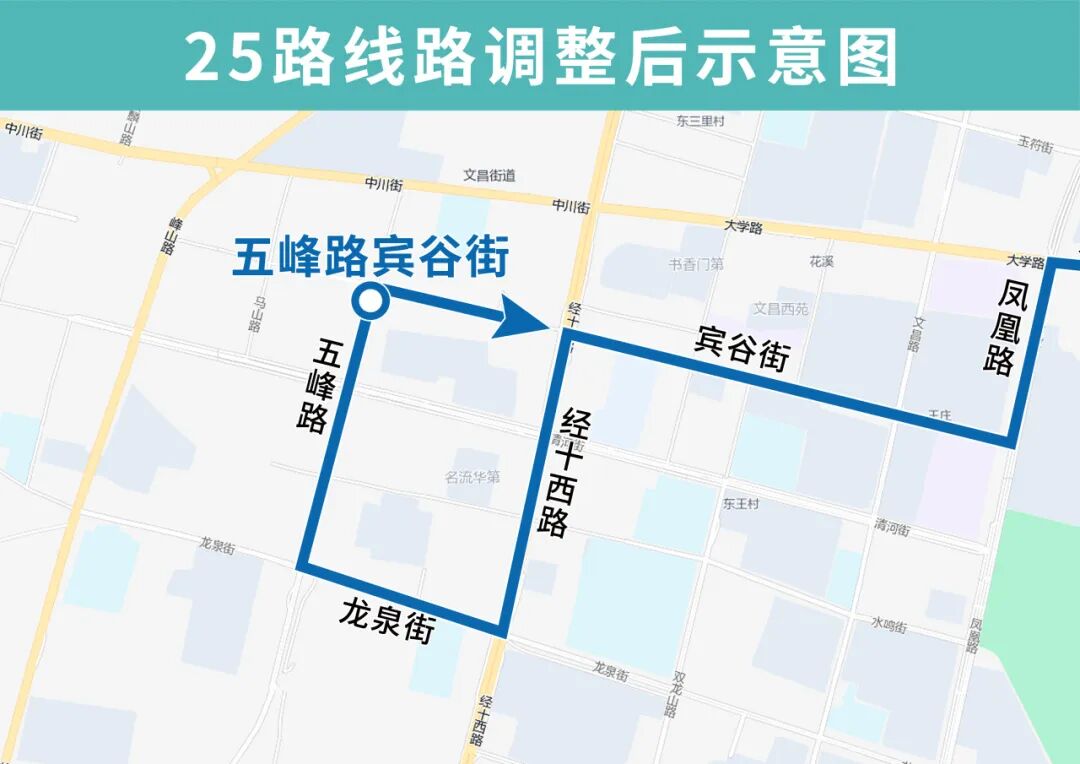 25路由炒米店开往五峰路宾谷街,优化调整后沿凤凰路向南、宾谷街向西,然后单向沿经十西路向南、龙泉街向西、五峰路向北至宾谷街向东恢复原线,沿途增设宾谷街凤凰路、文昌花苑南门、宾谷街双龙山路、宾谷街莲台山路、经十西路宾谷街(路西)站点,撤销凤凰路清河街、长兴美郡、龙泉街文昌路、长清一中站点,同时部分站点进行更名,山东师范大学更名为山师长清湖校区、龙泉街更名为五峰路龙泉街、清河街更名为五峰路清河街、宾谷街更名为五峰路宾谷街、宾谷街中段更名为宾谷街经十西路。