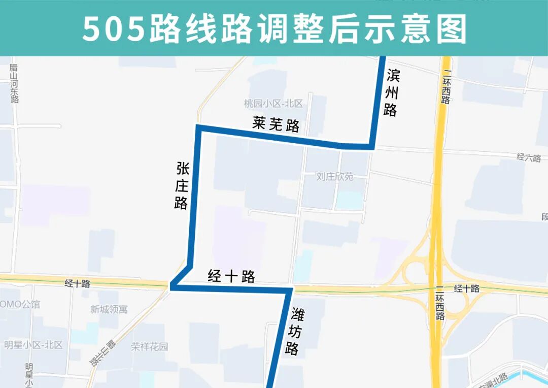 505路由重汽彩世界开往潍坊路安澜北路,优化调整后沿莱芜路向西、张庄路向南、经十路向东至潍坊路向南恢复原线,沿途增设桃园小区西、名士花园、张庄路经十路、地铁腊山站(路南)、刘庄站点,撤销潍坊路经十路站点,同时部分站点进行更名,滨州路经六路更名为滨州路莱芜路。