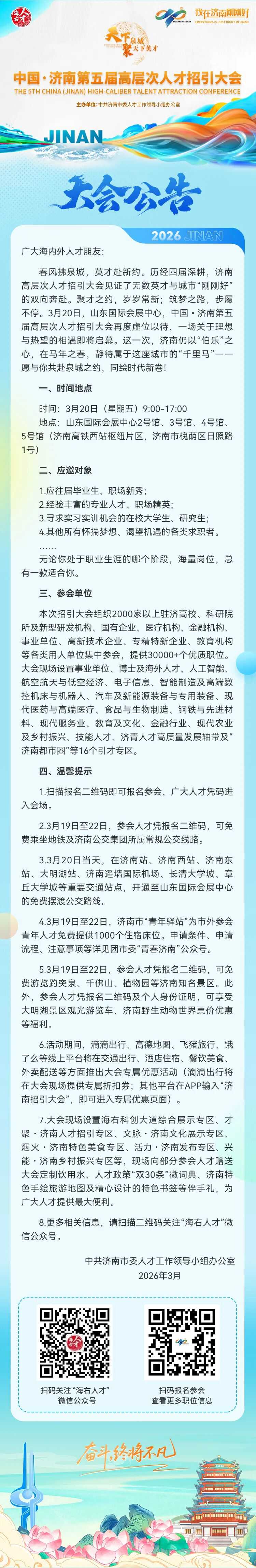 万事俱备,“职”等你来!即将开幕的第五届高层次人才招引大会,注定不只是一场汇聚海内外英才的求贤盛宴,更将是一次触摸济南发展脉动、沉浸式体验“刚刚好”城市魅力的双向奔赴之旅。
