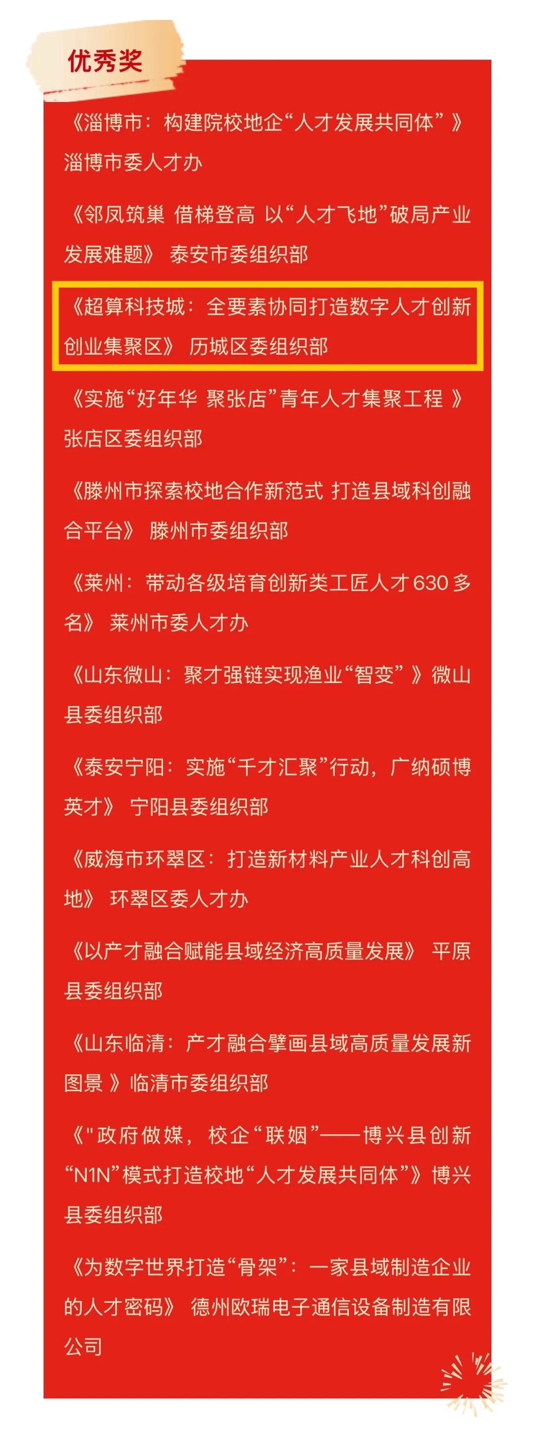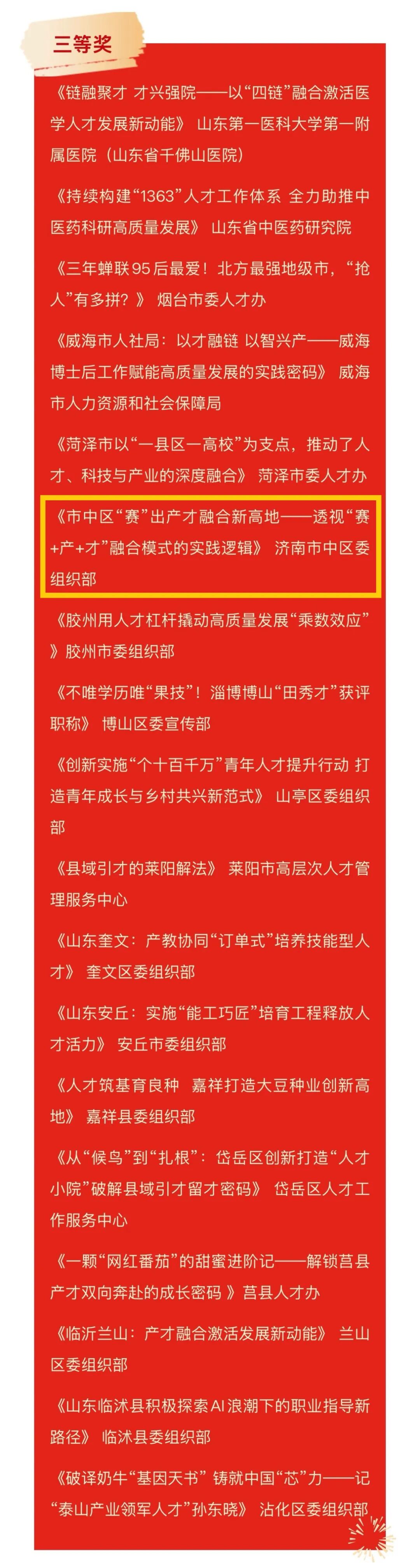 此外,济南市人才服务中心报送的《泉城人才 全程服务 全力推动人才与城市双向奔赴》、济南高层次发展促进会报送的《凌沛学:让中国玻尿酸从济南走向世界》荣获文字类宣传作品二等奖,市中区委组织部报送的《市中区“赛”出产才融合新高地——透视“赛+产+才”融合模式的实践逻辑》荣获文字类宣传作品三等奖,历城区委组织部报送的《超算科技城:全要素协同打造数字人才创新创业集聚区》荣获文字类宣传作品优秀奖;济南市委组织部获评为优秀组织奖。