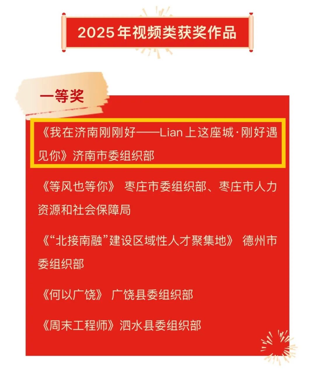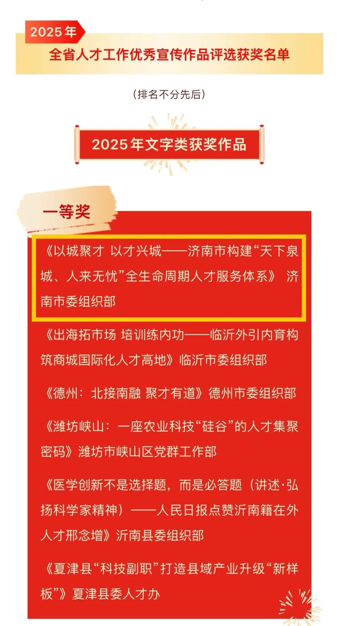 本次评选中,济南市委组织部报送的多项作品脱颖而出、斩获佳绩。其中,文字类宣传作品《以城聚才 以才兴城——济南市构建“天下泉城、人来无忧”全生命周期人才服务体系》、视频类宣传作品《我在济南刚刚好——Lian上这座城·刚好遇见你》双双获得一等奖(全省共评选出文字类一等奖作品6件、视频类一等奖作品5件),这也是济南市连续3年获此佳绩。