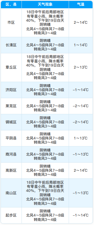 18日中午前后局部地区有零星小雨,降水概率40%,下午到19日白天阴转晴,北风4~5级阵风7~8级转南风3~4级,最低气温市区2℃左右,其他区县-2~2℃,最高气温14℃左右。