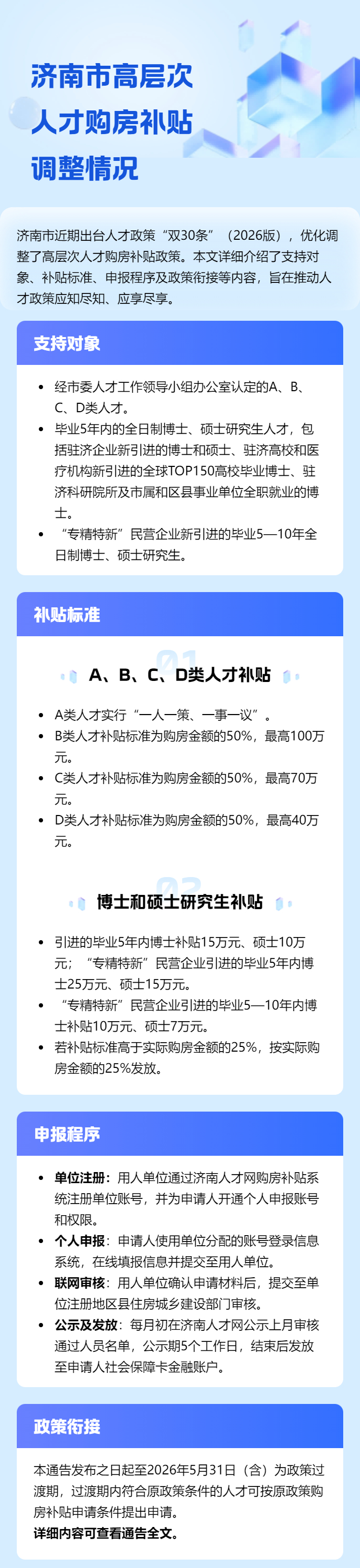为优化人才发展环境,支持人才来济在济发展,近期济南市出台济南人才政策“双30条”(2026版),对高层次人才购房补贴政策进行了优化调整。近日,济南市住房和城乡建设局发布济南市高层次人才购房补贴调整情况“明白纸”,就申报范围、条件、程序等进行逐一说明。