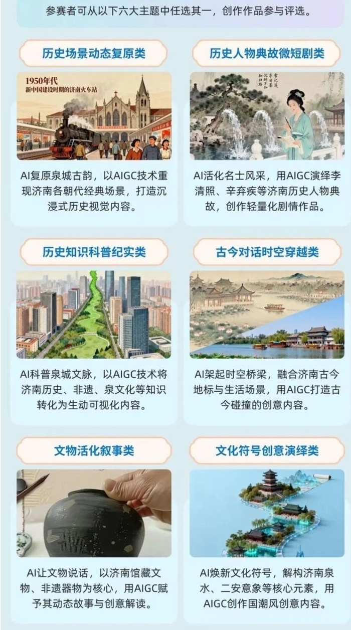 据了解,本次大赛由济南市大数据局、济南市人工智能产业发展办公室主办。本次比赛聚焦济南历史活化,邀请创作者运用优质AIGC模型,以数字创意唤醒城市文脉,让传统文化焕发新生。参赛者创作的作品需基于AIGC技术,深入挖掘齐鲁文化内涵与价值,围绕济南历史、文化、地标、文物等核心元素展开。作品需紧扣主题,坚持原创,视频效果自然流畅,时长不少于30秒。