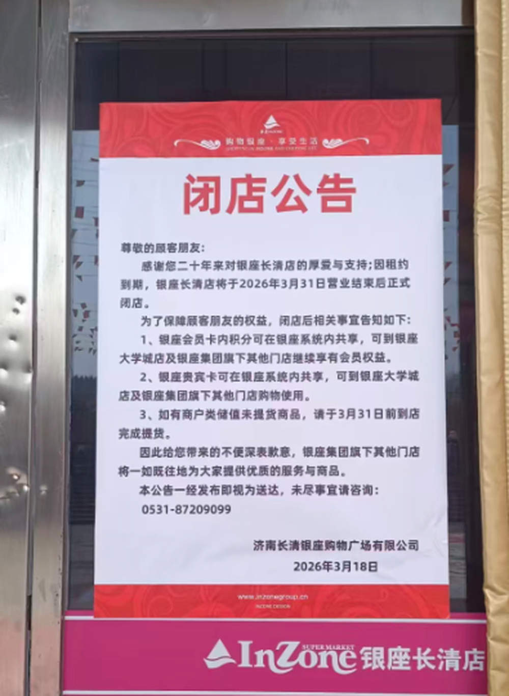 近日,山东银座商城股份有限公司官宣,因租约到期,开业已有20年的银座长清店定于2026年3月31日营业结束后正式闭店。3月21日,银座集团济南二区副总经理王先生在接受记者采访时表示,该店实际上早在去年底即有闭店意向,主要原因除租约到期外,更重要的因素是明珠新世纪商业广场物业长期维护不善,加之商圈重心转移,导致该店经营近年来持续亏损,集团经多次协调评估后,无奈只好闭店止损。