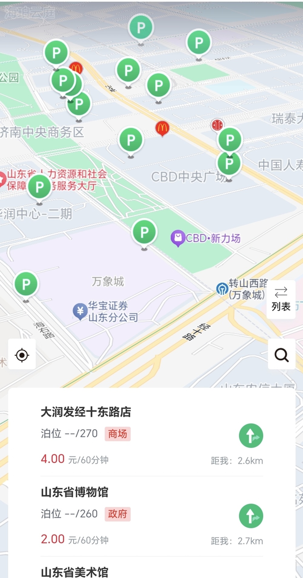 也就是在这次启动活动中,“中建泉智汇”济南CBD智慧停车小程序上线。为前往济南CBD的机动车和非机动车进行停车停放导航。机动车导航容纳了目前已开放的全部停车位,以及依据车主定位,协助找到最近的停车场。界面同时会显示停车位余量和价格,协助车主按图索骥。