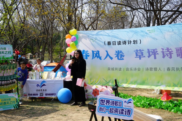 此外,同期开展的“春日共读·让全城听见”全城联动计划,得到了济南大学幼儿园、济南辰星公益志愿者团队等各类团体的踊跃参与,将诗意舞台延伸至更广阔的空间。济南市图书馆为报名团队提供专属“春日诗歌包”与配套支持,鼓励自主策划、共创共享,让诗歌走出书斋,走进街巷、校园与社区,使春日的济南处处流淌着诗意。