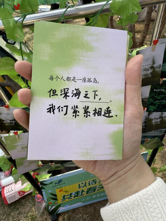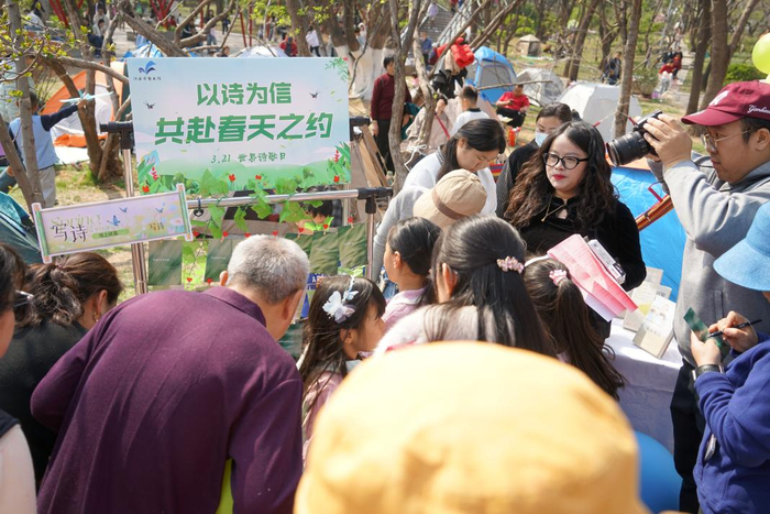 暖场环节,“诗歌接龙墙”提前开放,市民游客可参与诗歌续写挑战,在草木芬芳中与文字相逢。济南市图书馆精选经典诗句作为开篇,邀请市民结合自身生活感悟与春日畅想自由续写,不设风格限制,鼓励多元表达,活动现场累计征集到百余件市民原创续写作品,每一段文字都承载着普通人对诗意的独特理解。