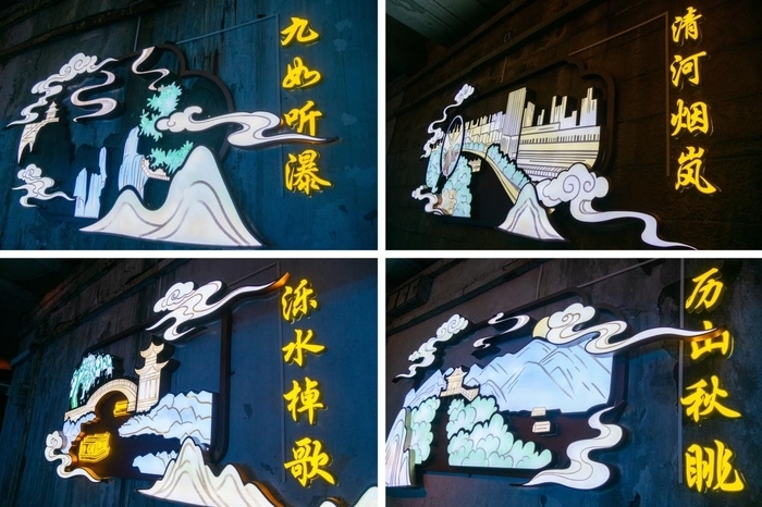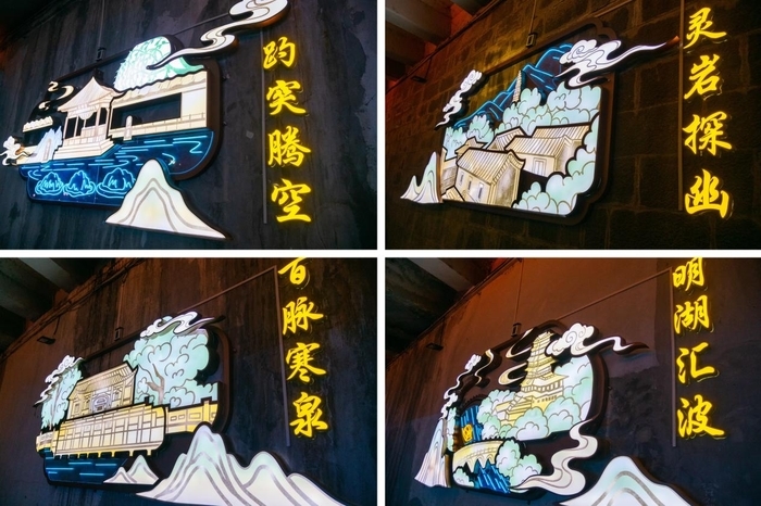 桥洞内壁点亮以“济南新八景”为主题的立体发光标识。百脉寒泉、灵岩探幽、明湖汇波、趵突腾空、九如听瀑、历山秋眺、泺水棹歌、清河烟岚八大盛景在眼前次第呈现。