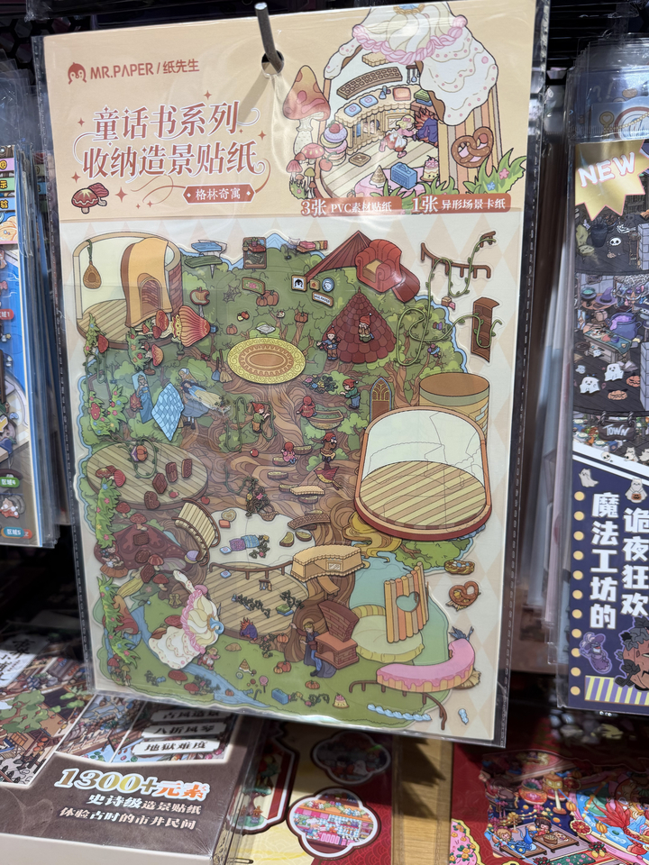 记者走访了三福、绿光派对、名创优品等多家线下商品店发现,造景贴纸已成为文具区的“流量担当”,甚至赶超近期大火的拼豆,占据了半面货架。不同于传统平面贴纸的单调,造景贴纸多是多层设计,搭配底板和镊子,主打“沉浸式拼贴”,价格也较亲民,单张10元左右,套装合集25元上下,堪称“平价解压神器”。