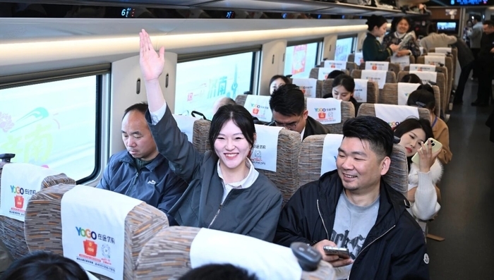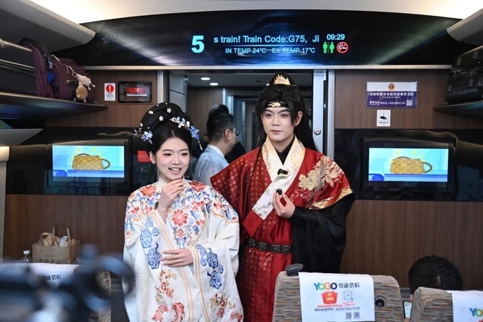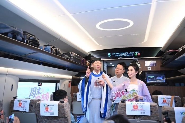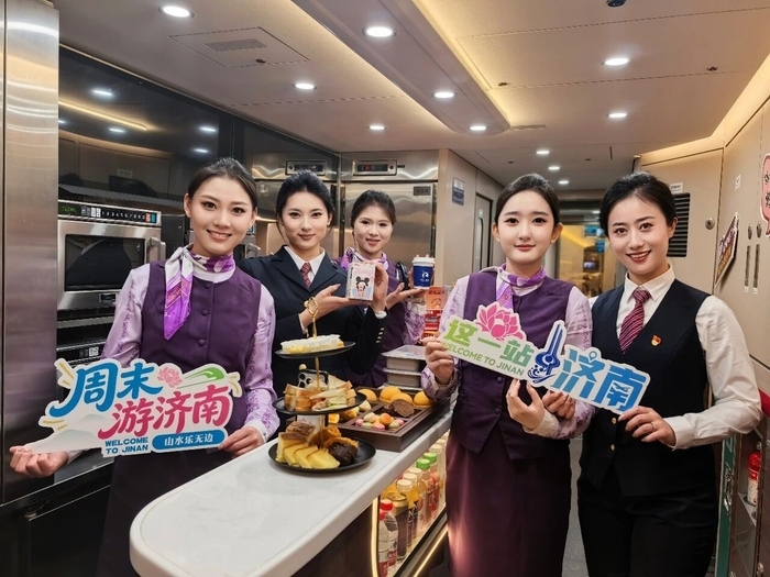 3月31日,“周末游济南”高铁主题营销活动在济南往返上海的G75/G76次列车上举行。本次活动由济南市文化和旅游局联合国铁济南局济南客运段、山东中铁文旅发展集团、济铁旅行服务有限公司共同主办。奔驰于京沪大动脉的列车化作“移动文旅会客厅”,以一场集非遗演艺、城市文创、美食品鉴、互动游戏于一体的沉浸式推介,向长三角游客发出“这一站,济南”的春日邀约。