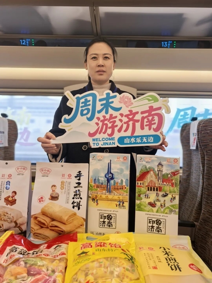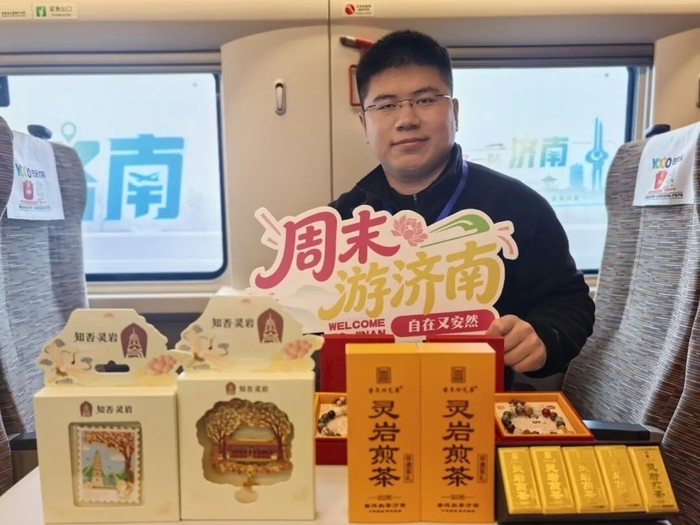 济南文旅推荐官家乐与任潇化身“一见清辛”组合(李清照、辛弃疾),带领旅客了解济南的人文历史、旅游资源和潮流地标。山东快书高派非遗代表性传承人尹国鹏带来一段经典《武松打虎》,赢得满堂喝彩;灵岩小书生与旅客轻松对答,介绍灵岩寺的千年古韵。济南市杂技团青年魔术师张云峰带来变幻莫测的近景魔术表演,令现场旅客惊叹连连;济南市歌舞剧院青年歌唱演员丁晓鹏深情演唱《鹊华秋色》,以歌声描绘元代画家赵孟頫笔下的济南山水画卷。天下第一泉风景区带来《金风玉露宜相逢》演艺互动,让旅客在轻松愉悦中提前“种草”泉城风情。济南市文化和旅游局还精心准备了博物馆文创、野风酥休闲食品等城市礼物,让旅客在高铁车厢里提前感受济南的热情与韵味。