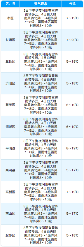 3日下午到夜间阴有雷阵雨转多云,4日白天晴,降水概率80%,南风转北风3~4级阵风7~8级,雷雨地区雷雨时阵风8~10级,最低气温市区7℃左右,其他区县5~7℃,最高气温19℃左右。