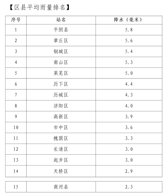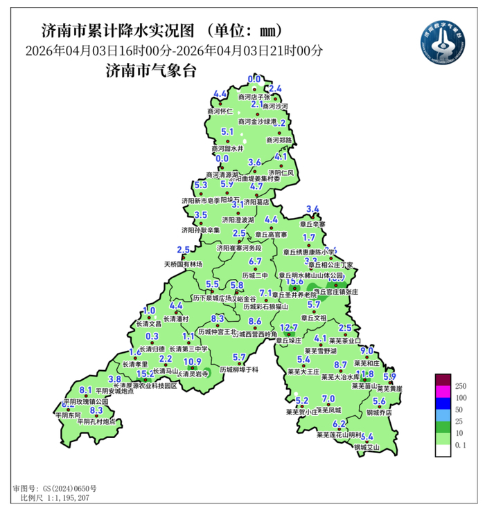 济南市气象台根据气象观测站网统计,4月3日16时至21时,全市平均降雨量达到4.3毫米,折合水量约0.4亿立方米。同一时段,全市216个测站中有69个极大风力超过8级,其中3个极大风力达到10级,极大风速26.7米/秒(10级),出现在章丘站。