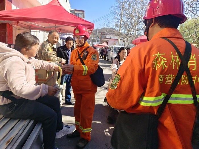 “打火机别揣兜里,进山前先放检查站;烟头不能乱扔,火星子蹦出来可了不得!”消防队员们正站在一处摊位前,用地道的方言给几位采购的村民“上课”。他们面前没有桌椅,却围了一圈听众——这是西营街道大集上的“流动防火讲堂”。