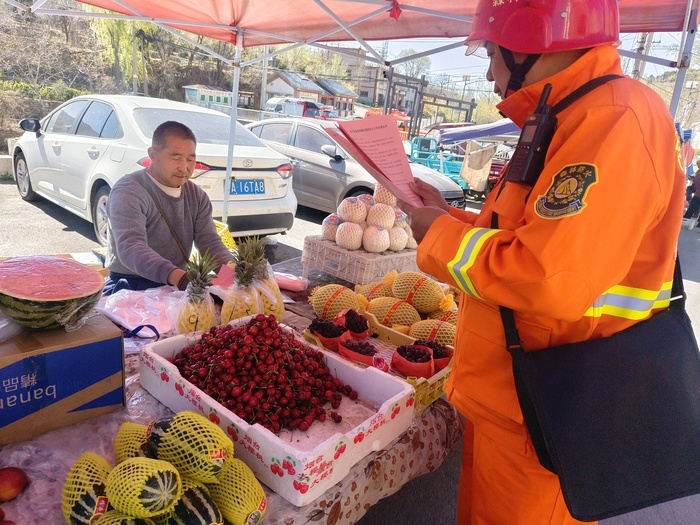 4月4日上午9时,清明节假期第一天,济南市南部山区西营街道大集上人流如织,前来采购的市民络绎不绝。在集市入口及主要通道处,多名身着工作服的西营街道消防工作人员正在向过往市民分发清明节假期防火宣传材料,并在现场面对面进行防火安全提示。