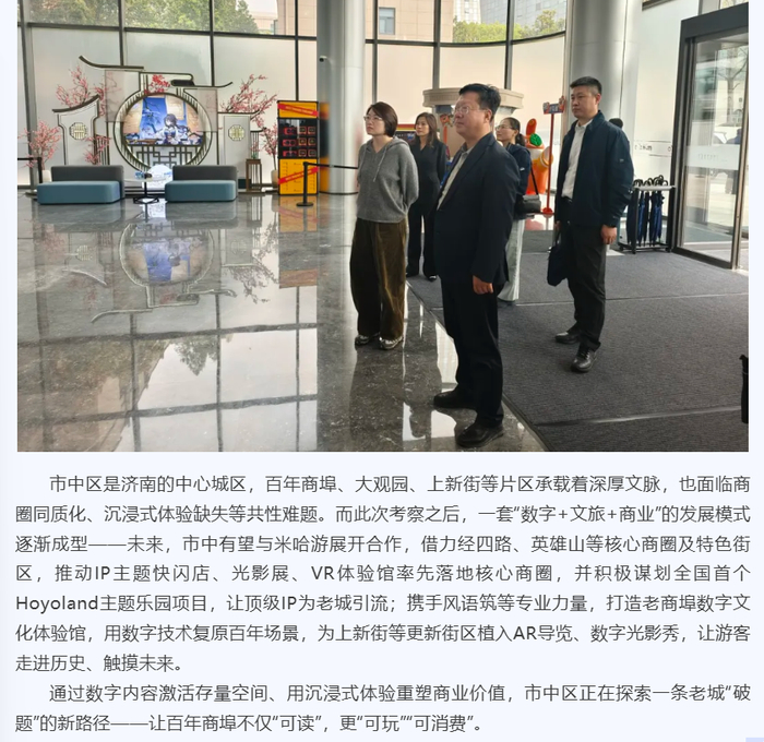 文章表示:“市中区是济南的中心城区,百年商埠、大观园、上新街等片区承载着深厚文脉,也面临商圈同质化、沉浸式体验缺失等共性难题。而此次考察之后,一套‘数字+文旅+商业’的发展模式逐渐成形——未来,市中有望与米哈游展开合作,借力经四路、英雄山等核心商圈及特色街区,推动IP主题快闪店、光影展、VR体验馆率先落地核心商圈,并积极谋划全国首个Hoyoland主题乐园项目”。