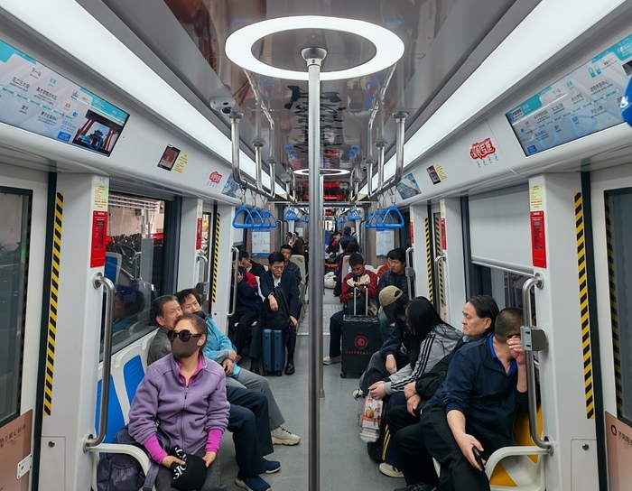 踏进车厢的一刻,清爽的凉气扑面而来。车厢内柔和的灯光带给人舒适的观感,车厢内的设计很像地铁,但座椅又像是地铁与公交的结合体——造型像地铁座椅,但有的向前,有的向后。
