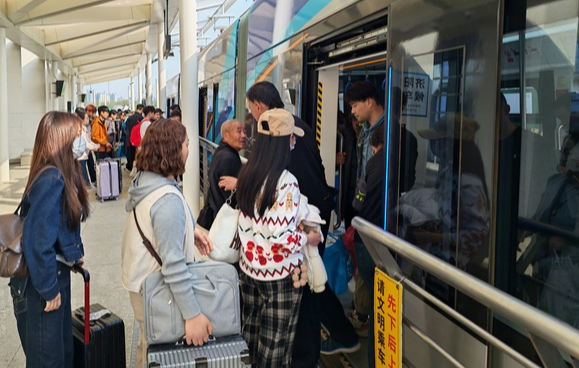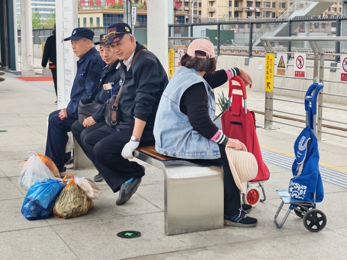 站台上已经排起了长队,一眼望去,乘客多是上了年纪的老人和三五成群的年轻人。有人手里提着成包的蔬菜和鼓鼓囊囊的包裹,有人拖着大大的行李箱,可能因为还没来得及换装,他们额头沁出了细汗。