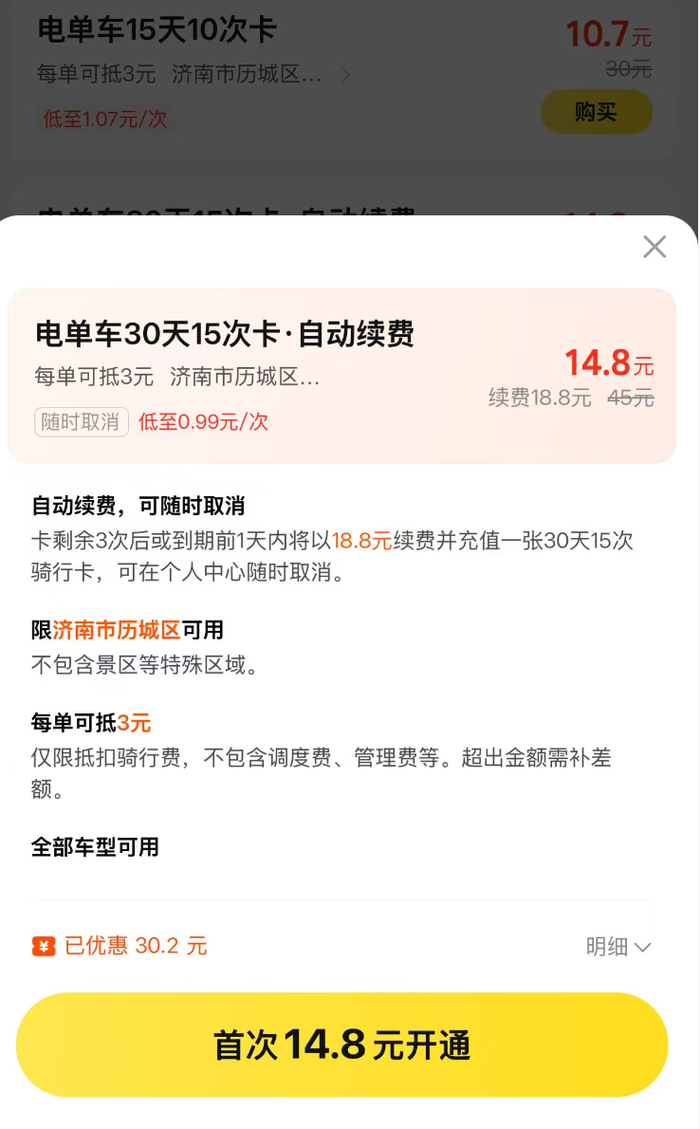 记者打开哈啰出行“蓝鲸号”电助力车体验发现,电助力车收费标准为前10分钟2.5元,运营范围被限定在历城区以及部分大学校园。记者尝试将定位切换到历下区、槐荫区,页面上出现多辆共享单车可供选择骑行,电助力车则显示“在运营区外,无法为您服务”,同时提醒用户确保在蓝色运营区内骑行,运营区外还车将收取调度费。