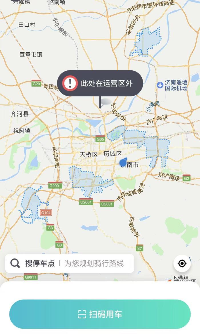 青桔电单车运营范围地图显示,目前车辆投放区域已涉及济南市中区、历城区、长清区、济阳区。
