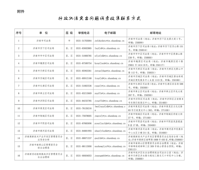 4月10日,济南市司法局发布关于收集行政执法突出问题线索的公告,为全面规范行政执法行为,维护企业群众合法权益,切实减轻企业负担,优化法治化营商环境,按照省涉企行政执法规范化建设年行动工作要求,公开收集行政执法突出问题线索。