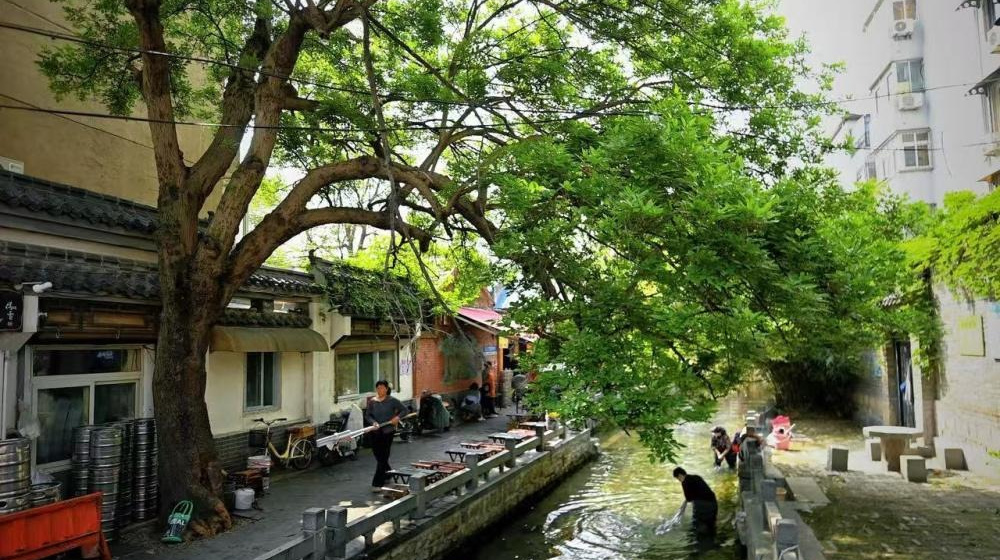 4月13日,春天的于家桥已是一片翠绿,清冽的泉水缓缓流淌,水草随水流轻轻摇摆,午时,不少附近居民在河边喝起扎啤纳凉。于家桥位于济南市天桥区铜元局后街,这里常年流淌着从五龙潭泉群向北流出的泉水,为枕河而居的人们提供着各种方便。