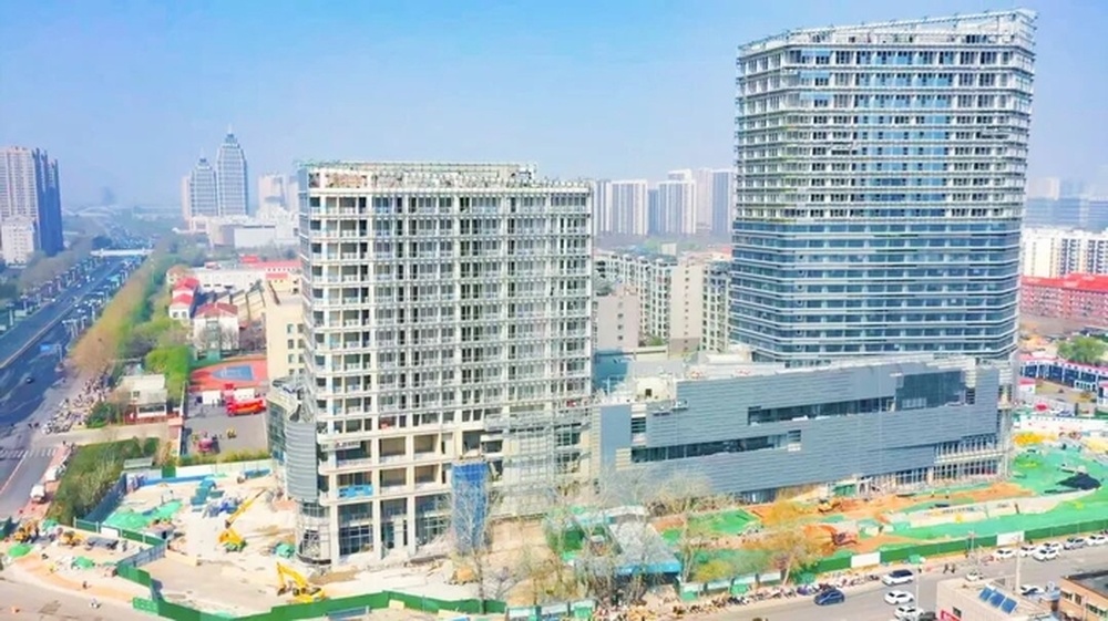 腊山站上盖开发项目是济南首座全融合式TOD项目,目前南北塔楼主体及二次结构已完工,精装修、幕墙安装与室外景观工程同步推进,玻璃幕墙安装加速。