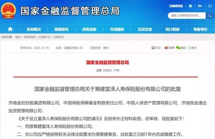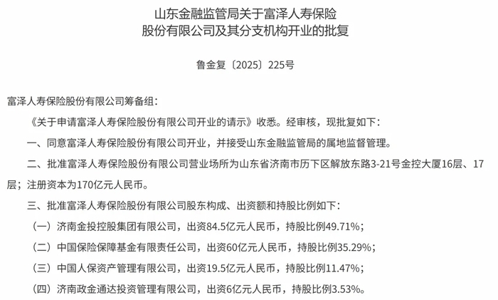 此次收购的买方是富泽人寿保险股份有限公司。2025年1月国家金融监督管理总局批复同意筹建富泽人寿,消息一出便备受关注。同年6月19日富泽人寿正式开业,注册地为山东省济南市。因其注册资本高达170亿元,当年被财经媒体誉为“险资航母”。