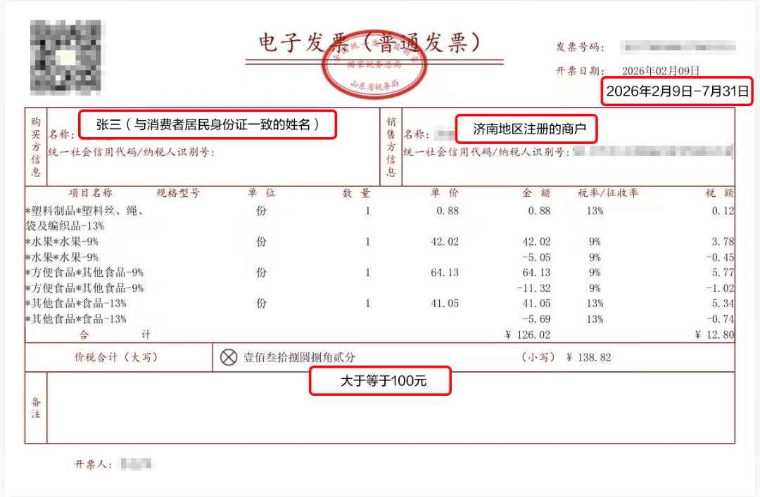 只要您在济南消费≥100元并索取了发票