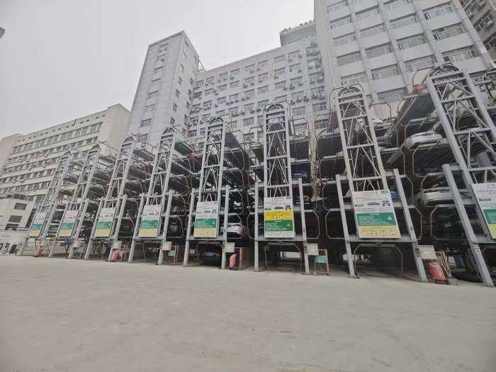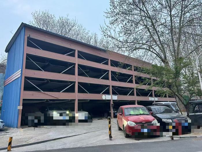 济南市中医医院一处钢架结构的立体停车场,建于2023年,外观目测建有3层停车区,停车设备形式包括平面移动类机械式停车设备和升降横移类机械式停车设备。由于建设时间较晚,该停车场对车辆尺寸限制相对宽松,可容纳车长小于5.3米、车宽小于1.95米、车高小于2.05米、重量小于2.3吨的车辆。