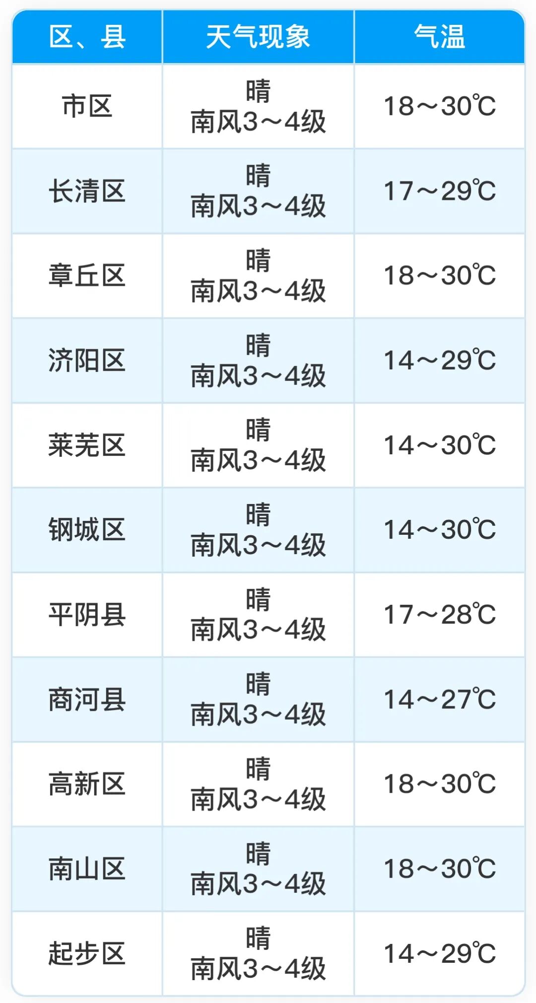 晴,南风3~4级,最低气温市区18℃左右,其他区县14~18℃,最高气温30℃左右。