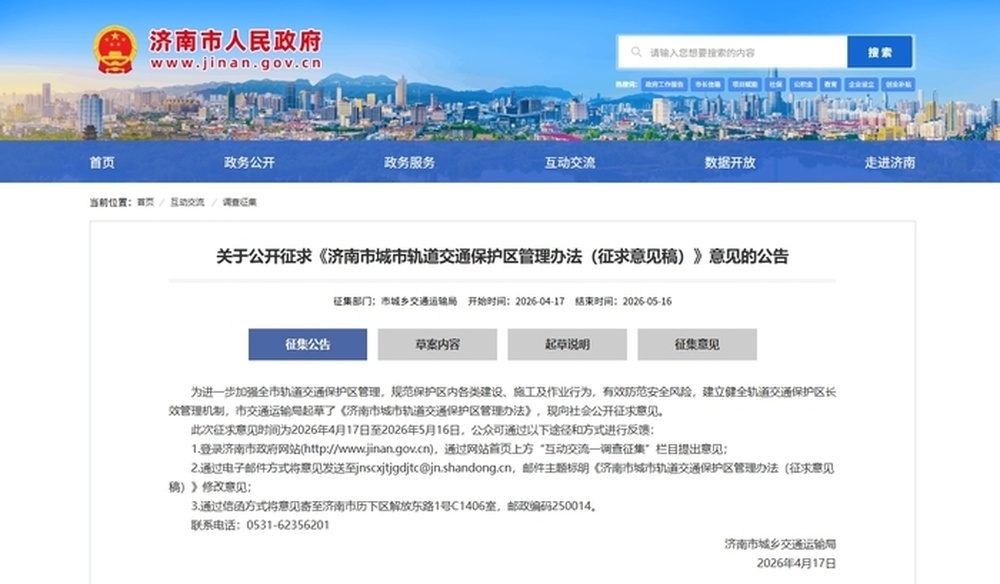 为进一步加强全市轨道交通保护区管理,规范保护区内各类建设、施工及作业行为,有效防范安全风险,建立健全轨道交通保护区长效管理机制,近日,市人民政府网站发布《济南市城市轨道交通保护区管理办法(征求意见稿)》,并向社会公开征求意见。
