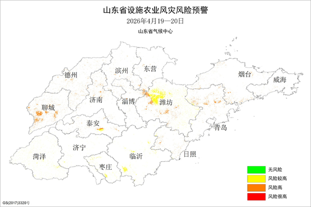 预计4月19日—20日,我省自西向东将出现一次强对流天气过程,并伴有7~9级局部10级以上的雷雨阵风,鲁南和鲁中局部降水量可达20毫米以上。受此影响,鲁西北、鲁中山区和半岛地区设施农业风灾风险等级高,其他地区设施农业风灾风险等级较高;鲁南大部、鲁中西部、鲁西北部分地区小麦倒伏风险较高。山东省气候中心和山东省农业技术推广中心建议各地针对性落实小麦防倒伏技术措施,提前做好农业设施防风加固等工作,确保农业生产安全。