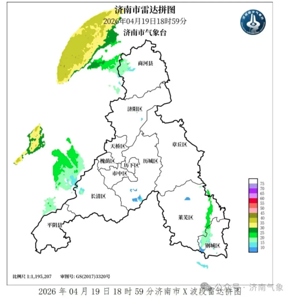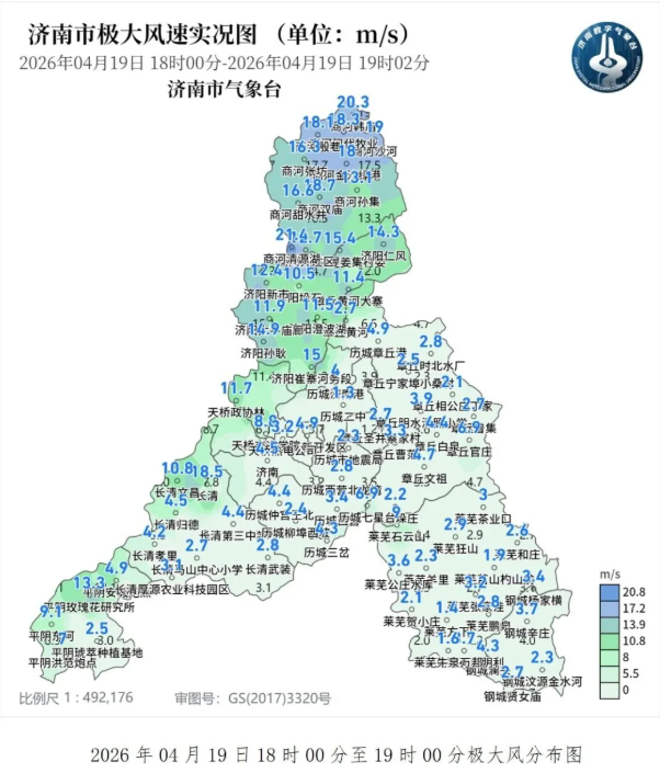 济南市气象台发布最新天气预报,2026年4月19日18时至2026年4月19日19 时,全市 216 个测站中有 13 个极大风力达到 8级,其中商河清源湖站极大风力达到9级,极大风速21.4m/s。