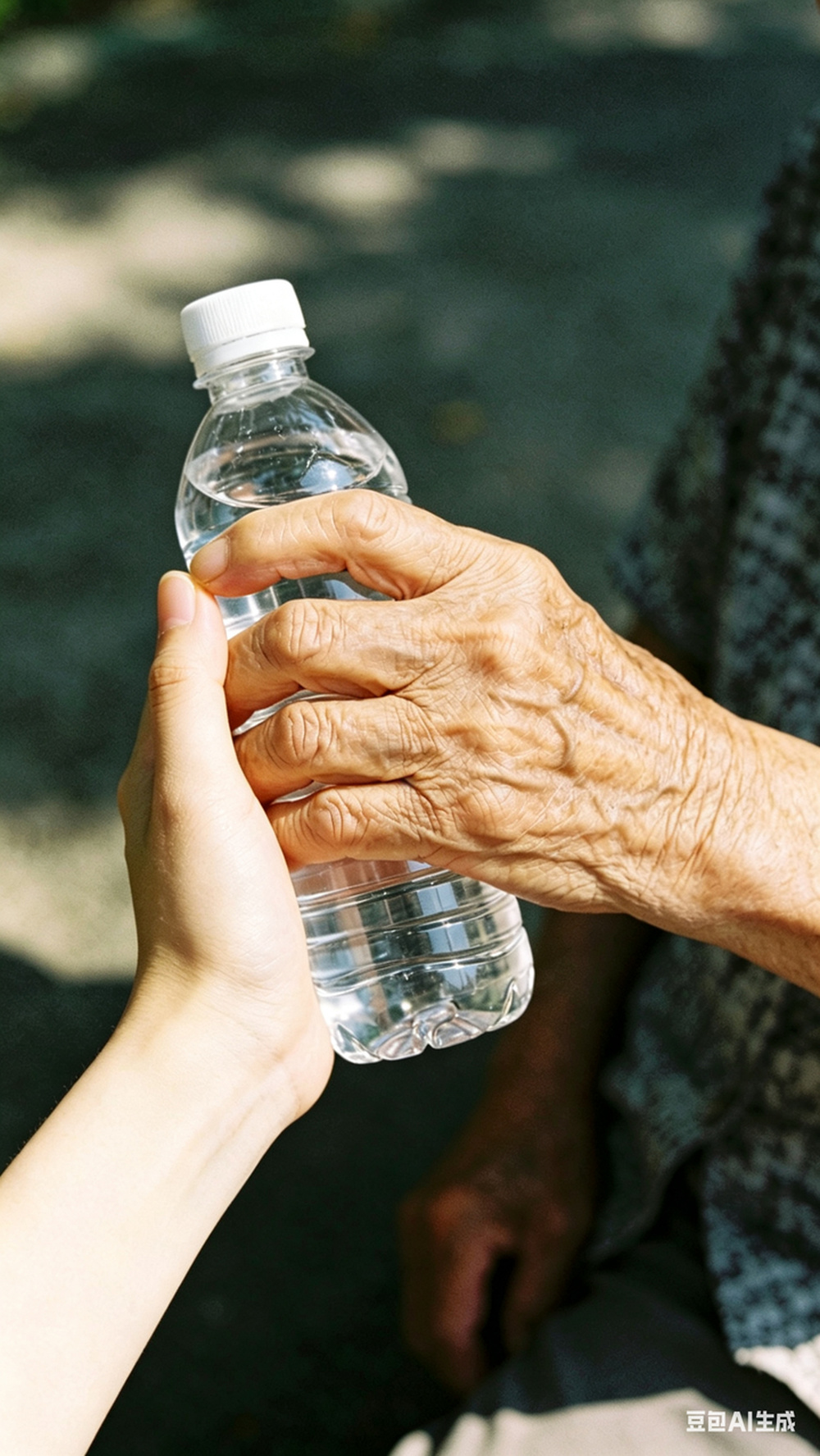猛的灌下几口水,老人才开始念叨:刚刚在路边买了水,路上却发现手疼得拧不开,渴了很久。